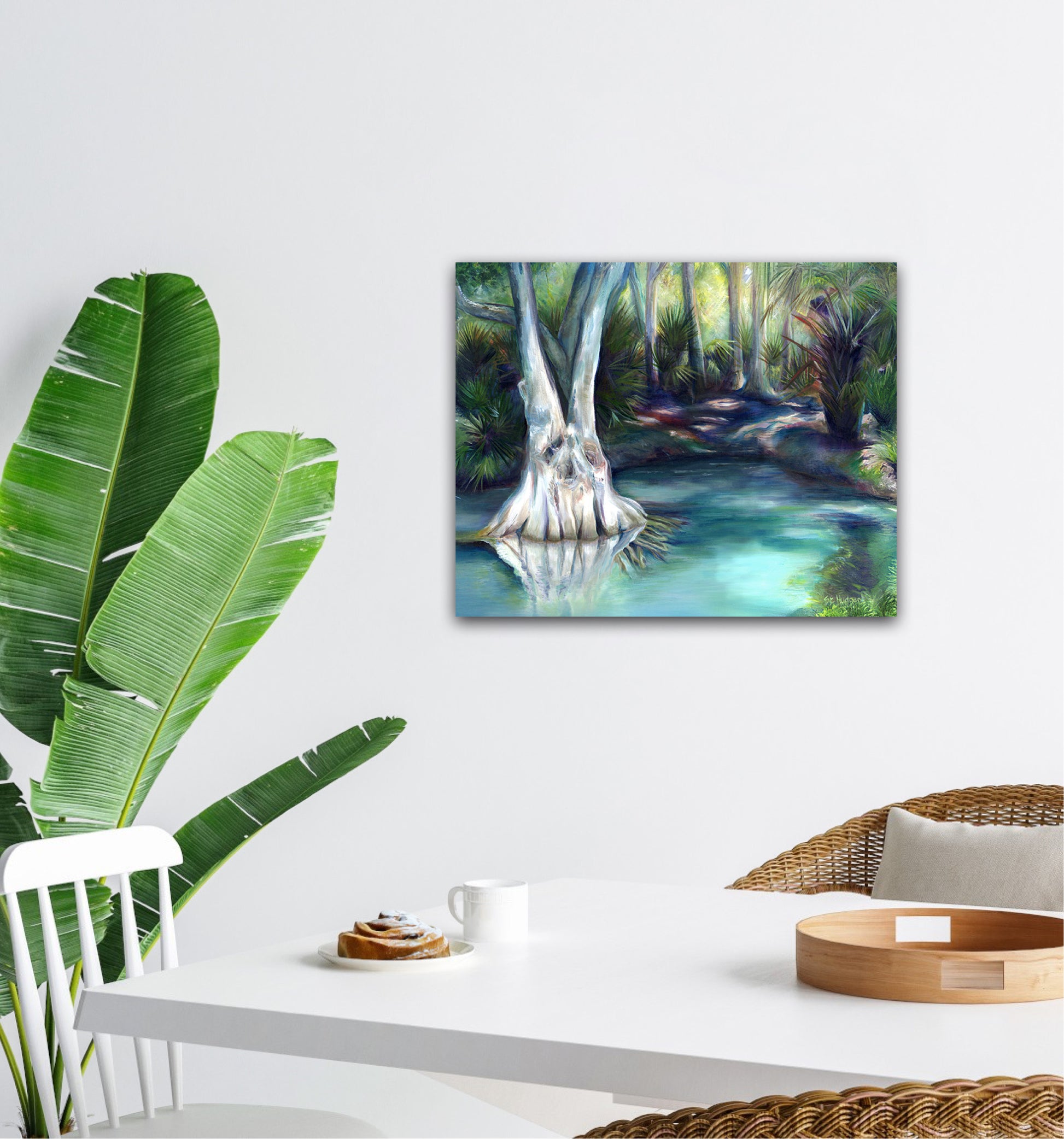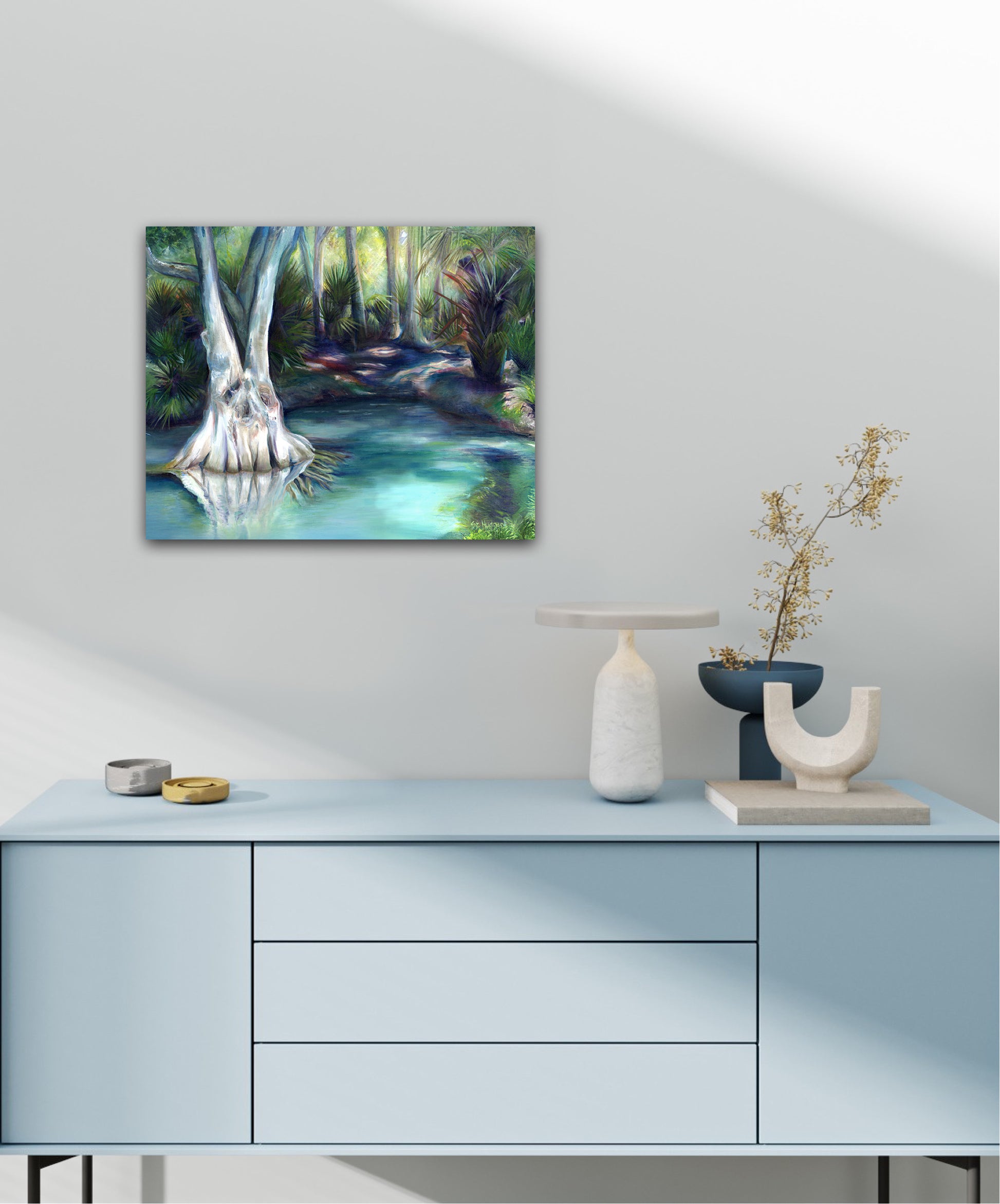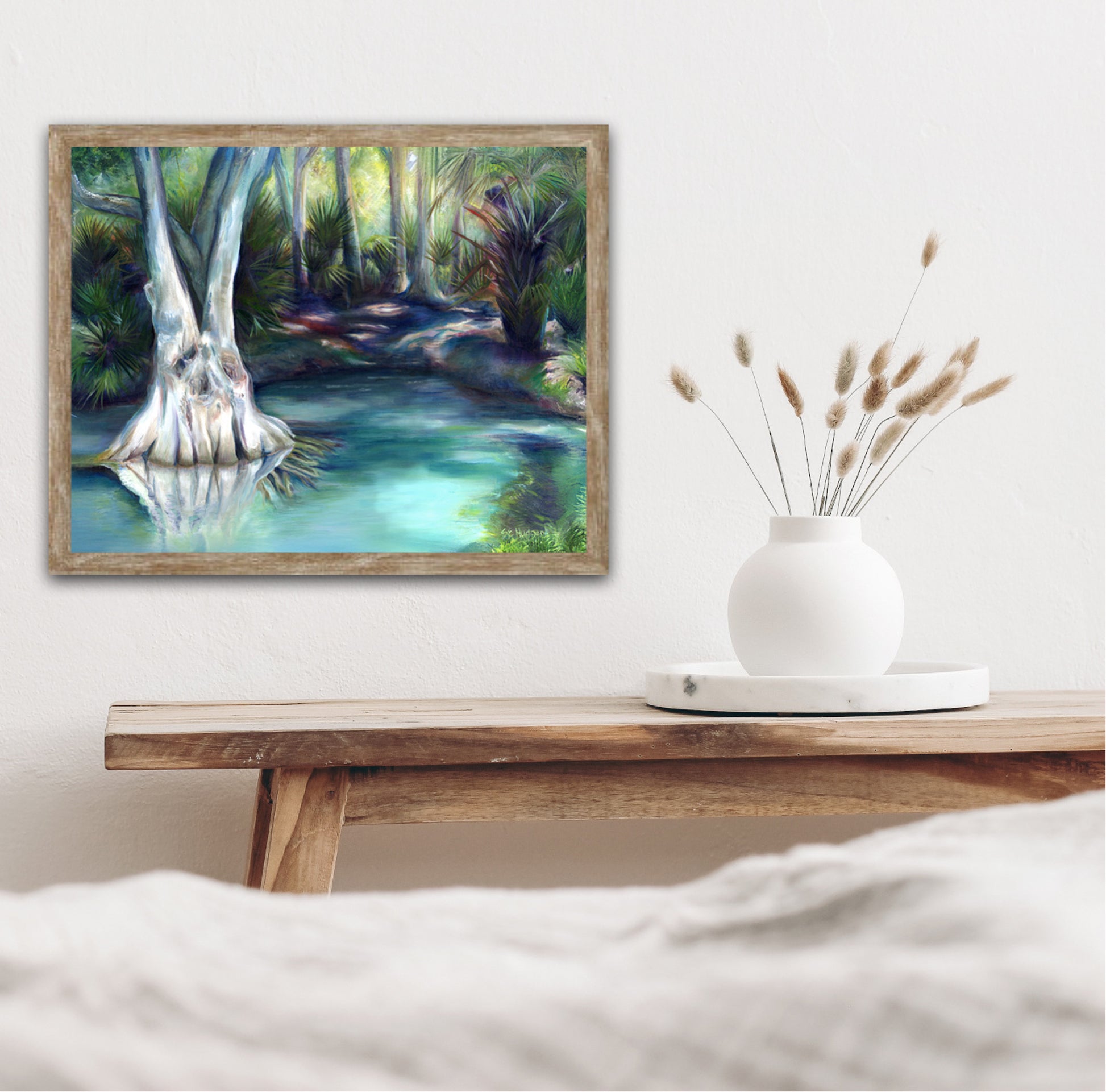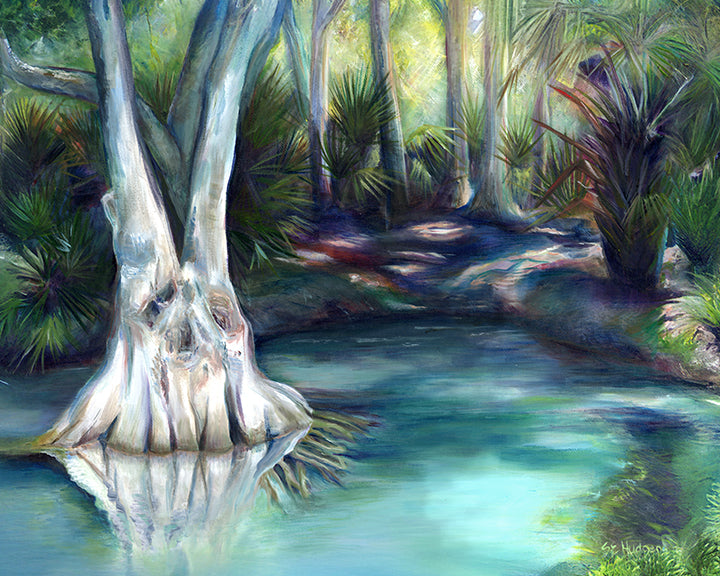 Here’s one of the pieces from the time when I was practicing good manners. It's always good to learn the rules first. This one is a print from my layered landscape period, from an original in acrylic on 16" x 20" canvas. It depicts one of my favorite spots on the spring-fed Rainbow River in Central Florida. The water is a constant 72 degrees even on the hottest day, and this shady cove is a sanctuary of vibrant peace.