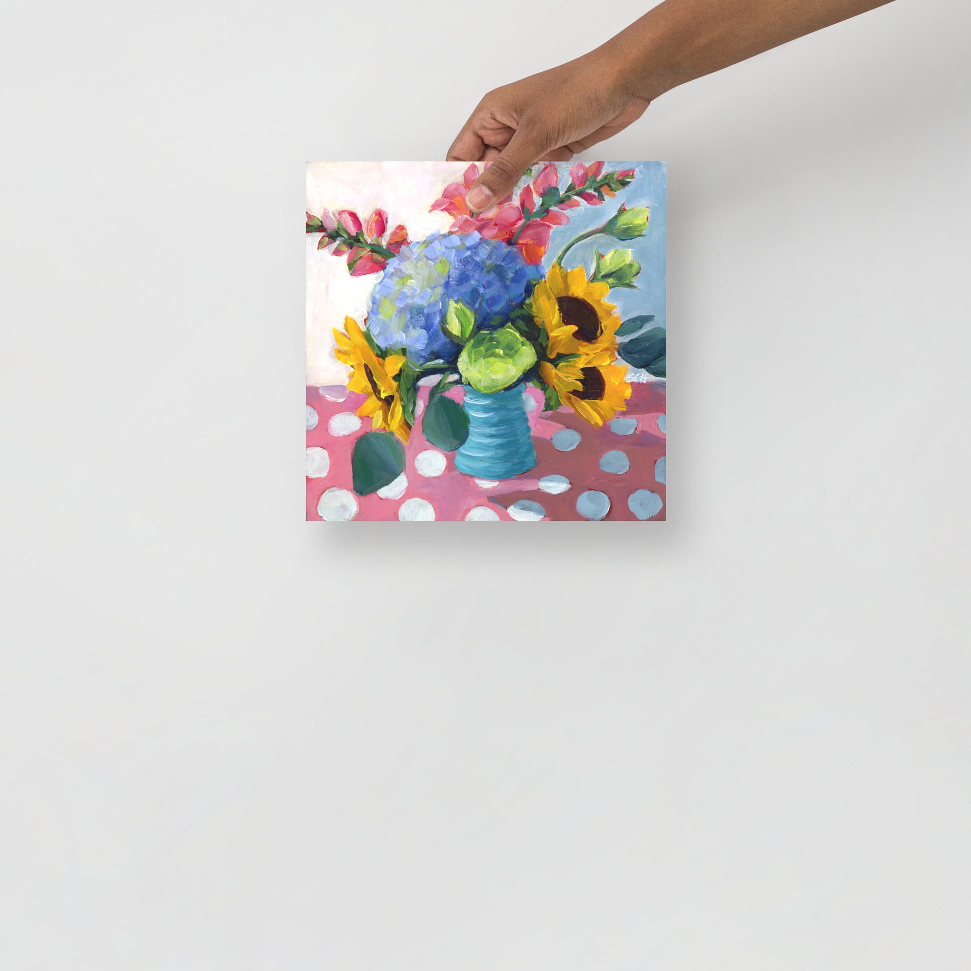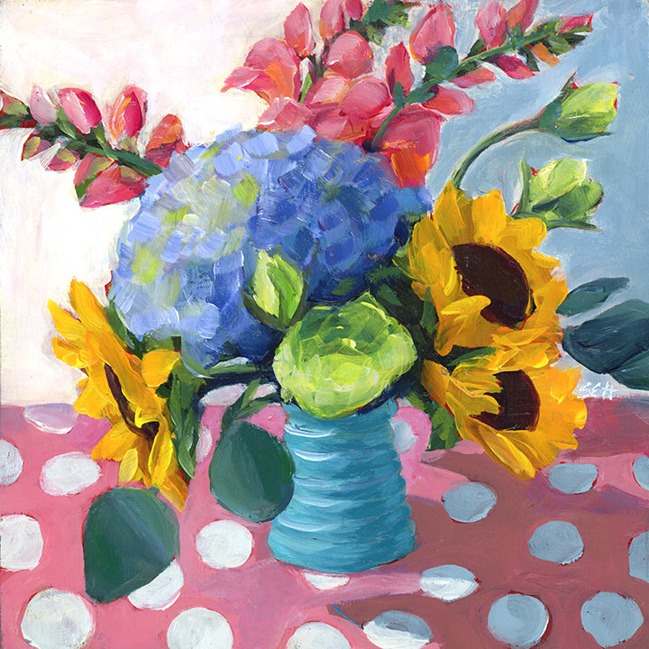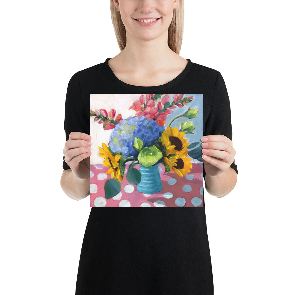 Here’s one of the pieces from the time when I was practicing good manners. It's always good to learn the rules first. This one is a print from my fun floral period, from an original in acrylic on 10"x10" cradleboard. Each print is on thick matte paper, providing a non-glare richness of color and contrast when viewed from any angle.