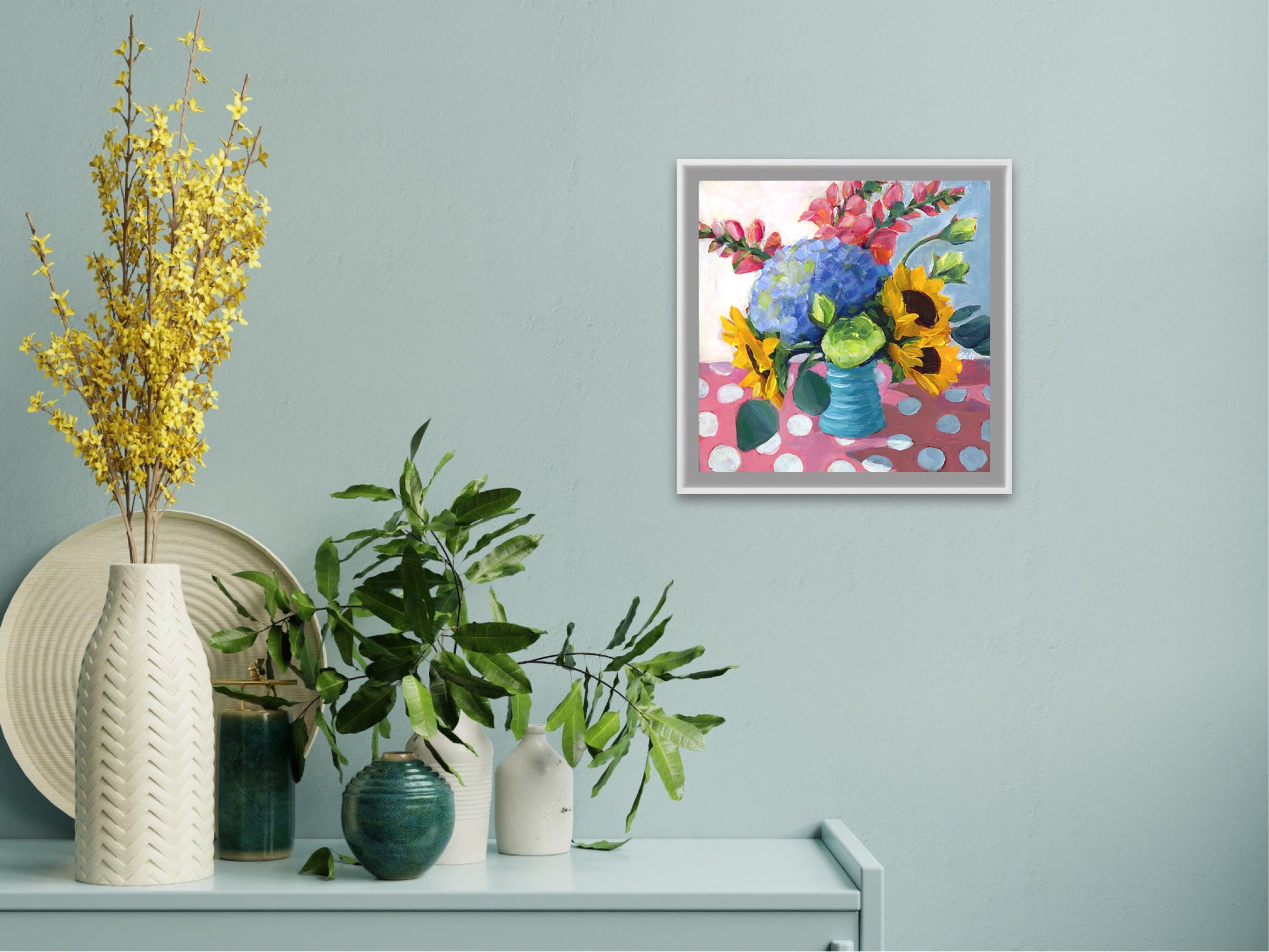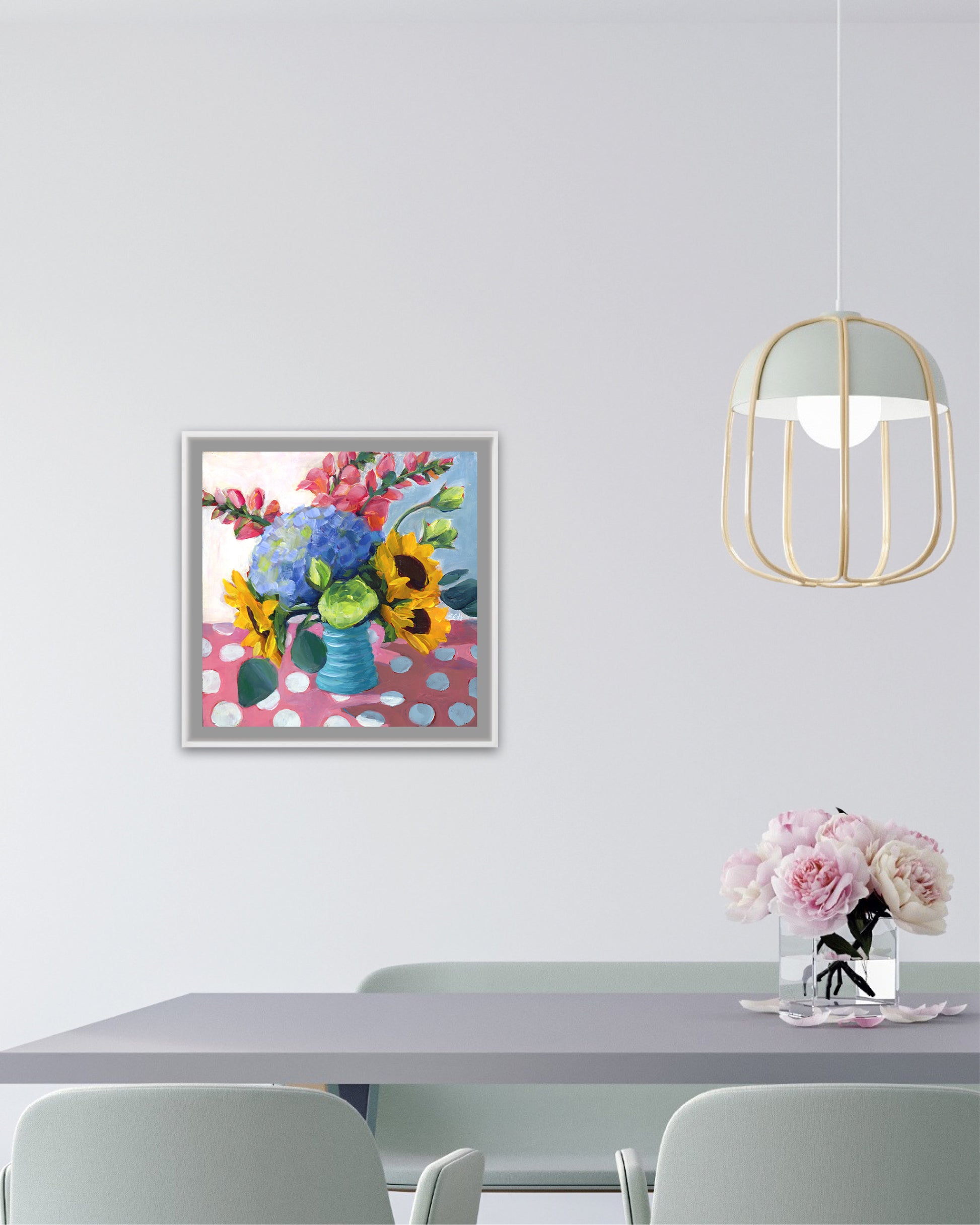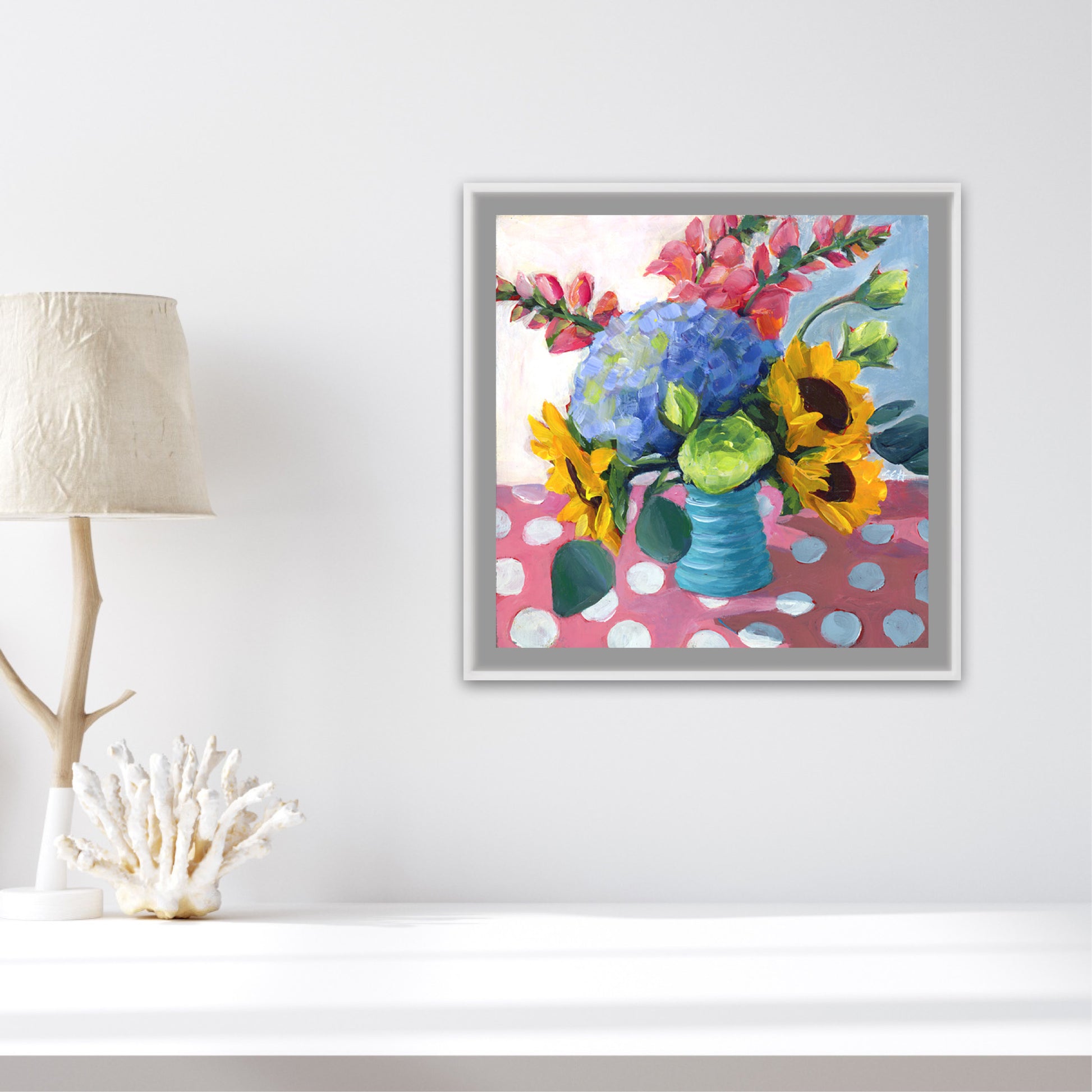 Here’s one of the pieces from the time when I was practicing good manners. It's always good to learn the rules first. This one is a print from my fun floral period, from an original in acrylic on 10"x10" cradleboard. Each print is on thick matte paper, providing a non-glare richness of color and contrast when viewed from any angle.
